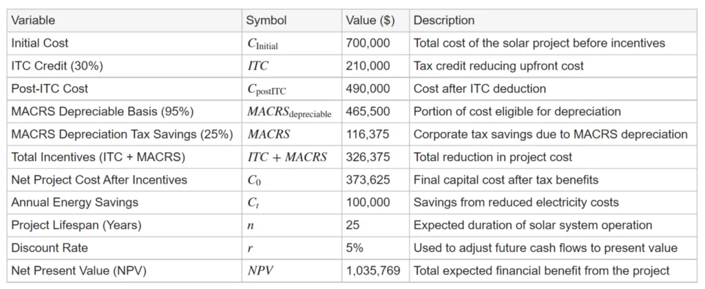 Consider a $700,000 solar project. The ITC reduces this cost by 30%, resulting in a $210,000 credit. This leaves $490,000 as the post-ITC basis for depreciation. Under MACRS, 95% of this post-ITC cost ($465,500) is depreciable. At a 25% corporate tax rate, the depreciation benefit adds $116,375 in tax savings. Combining the ITC and MACRS benefits yields $326,375 in incentives, cutting the project’s net cost by nearly half and accelerating the solar payback period. Additionally, selling RECs can further offset costs, depending on market conditions.